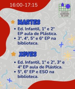 martes (ed. infantil e primaria) e xoves (ed. infantil, primaria e ESO)